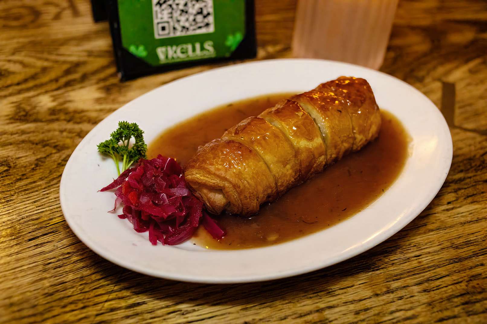 Locally sourced organic pork sausages, mashed potatoes and demi-glaze. Served with Kells own mustard sauce.